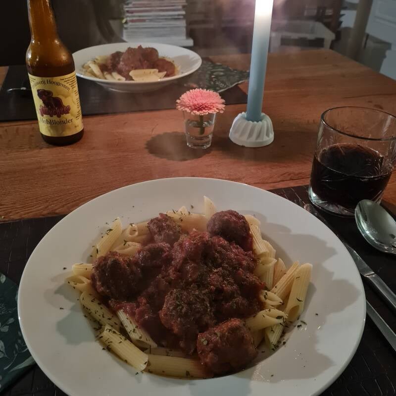 * Schep de balletjes in de tomatensaus en laat het nog 30 minuten op een zacht vuurtje pruttelen