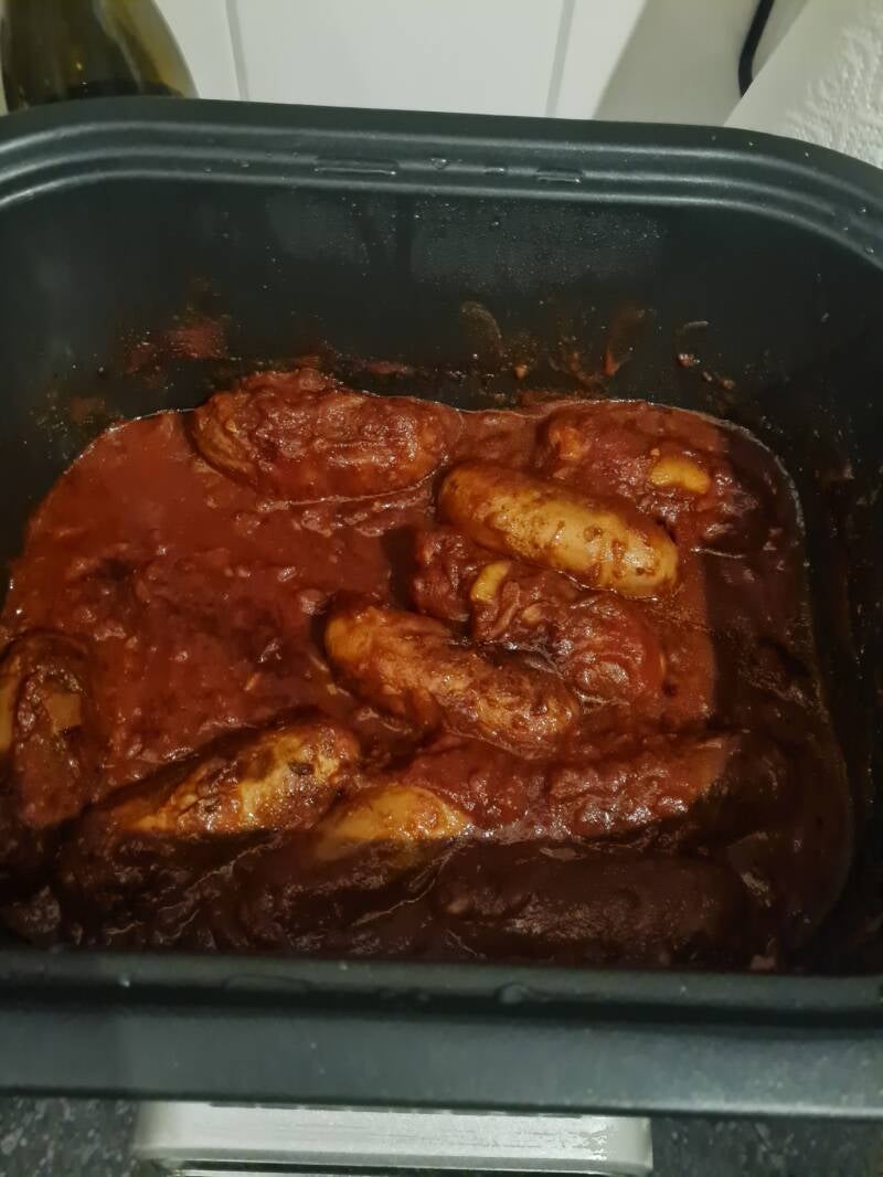* Doe alle ingrediënten met uitzondering van de worstjes in de slowcooker.