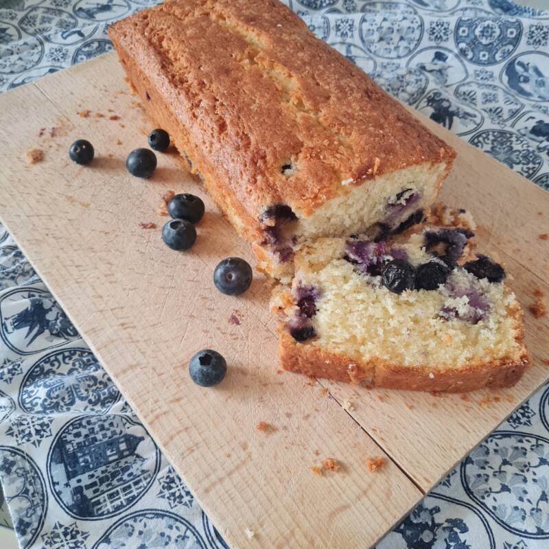 Een heerlijke smeuiige cake met verse blauwe bessen.