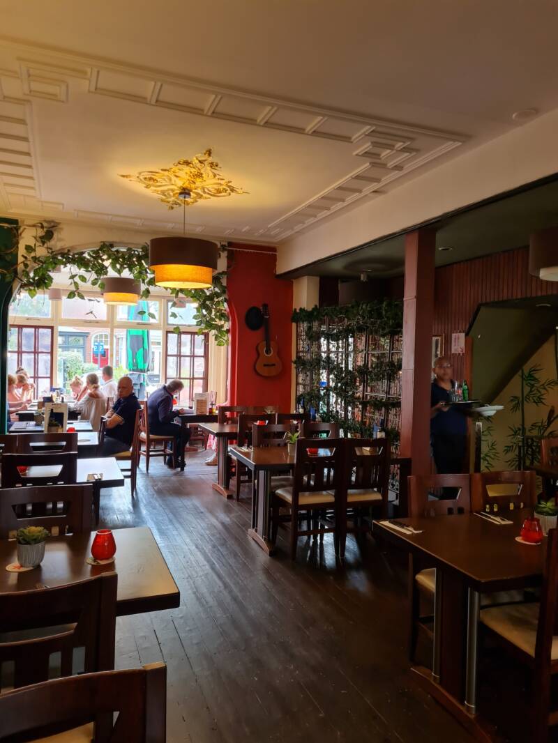 Het terras was op 2 tafeltjes na helemaal vol, wij wilden binnen zitten, er was een lange tafel bezet met zes