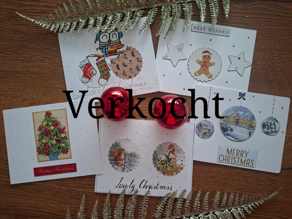 Een set van 5 handgemaakte kerstkaarten met enveloppen en als extraatje een gratis kerstlabel.