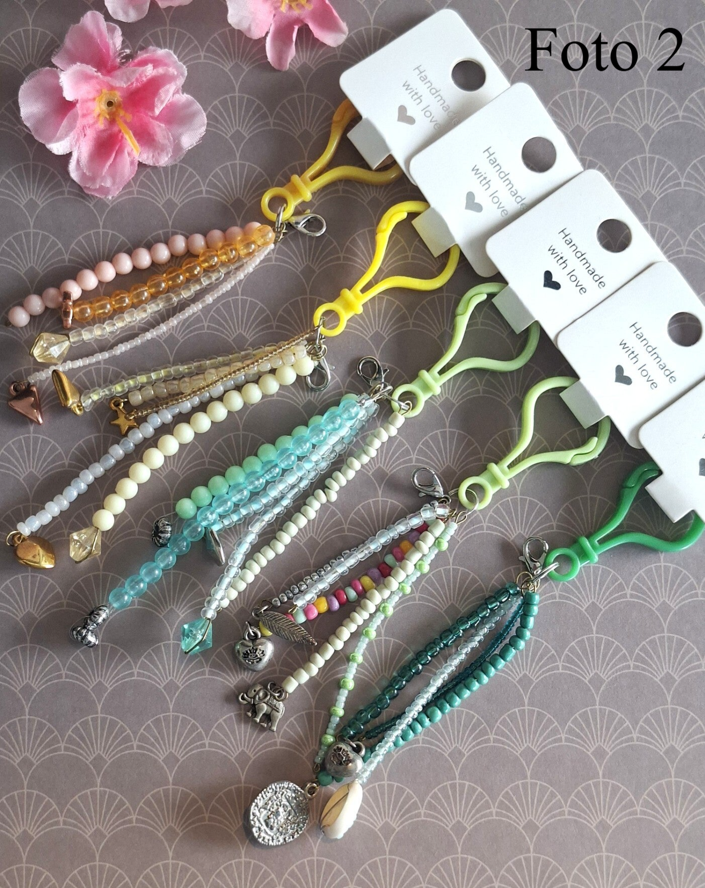 Handgemaakte sleutelhangers in verschillende kleuren.